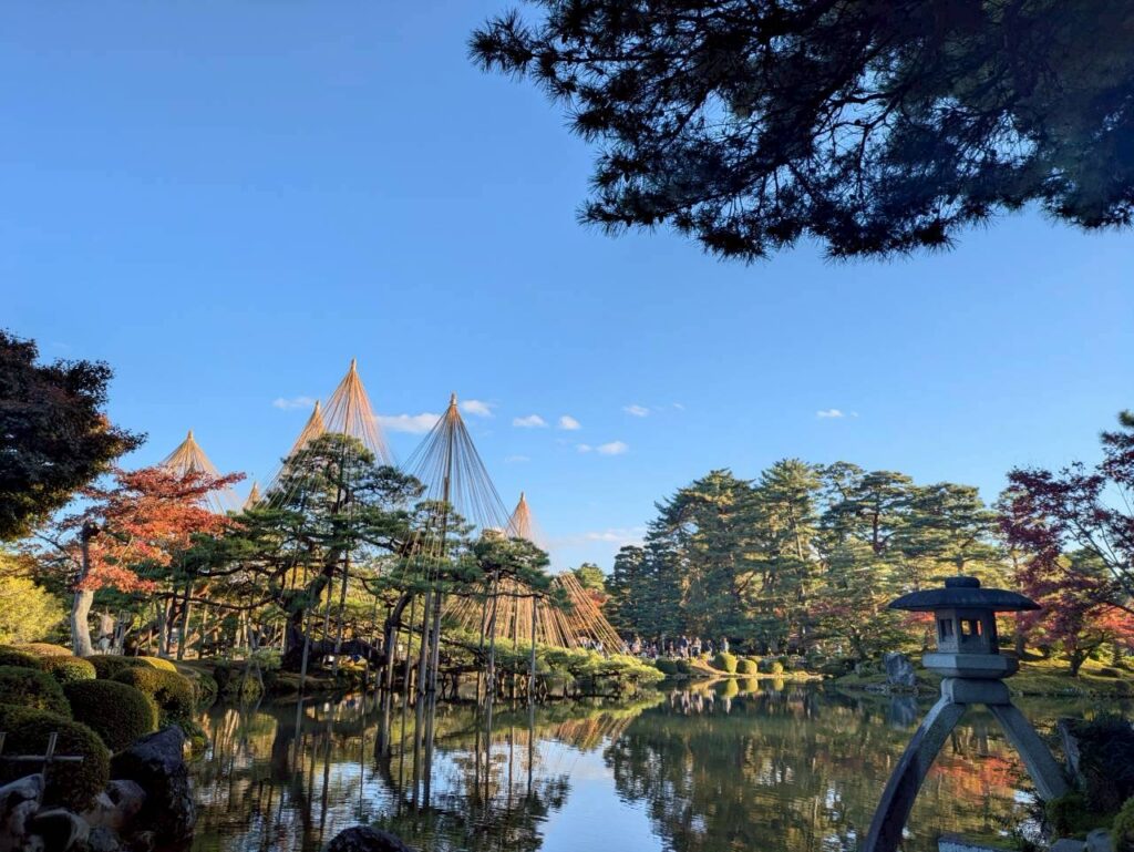 兼六園も雪吊りと紅葉が池に映り美しく幻想的でした🍁